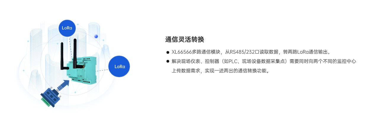 XL66566多路通信模塊是一款高效靈活的通信轉(zhuǎn)換設(shè)備,可將RS485設(shè)備的一路輸出信號(hào),轉(zhuǎn)為2路LoRa輸出信號(hào),有效滿足了工控設(shè)備同時(shí)將數(shù)據(jù)接入兩個(gè)Modbus主站的需求,簡單、方便、易用,成本更低,滿足多種場(chǎng)景需求。