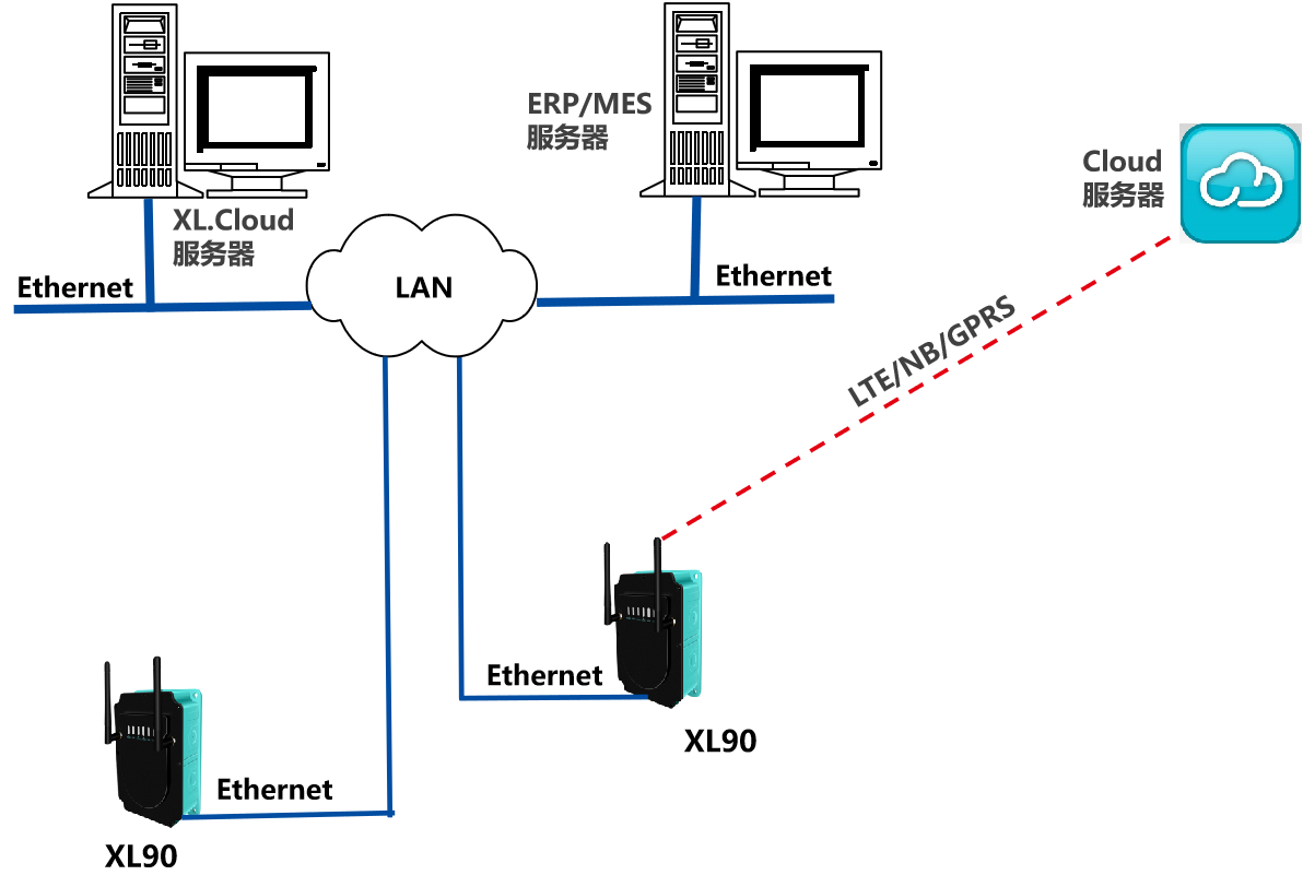 如下圖所示,XL90,將數(shù)據(jù)上傳給企業(yè)內(nèi)部的多個系統(tǒng)軟件平臺;通過LTE(4g)/NB/GPRS將數(shù)據(jù)上傳至云服務器;