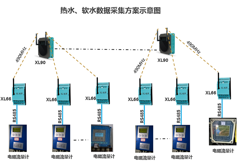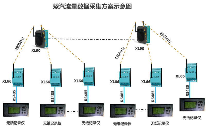 每個(gè)監(jiān)測點(diǎn)配置1臺(tái)XL66智能轉(zhuǎn)換器,從無線記錄儀讀取蒸汽流量數(shù)據(jù),上傳至XL90物聯(lián)網(wǎng)關(guān)