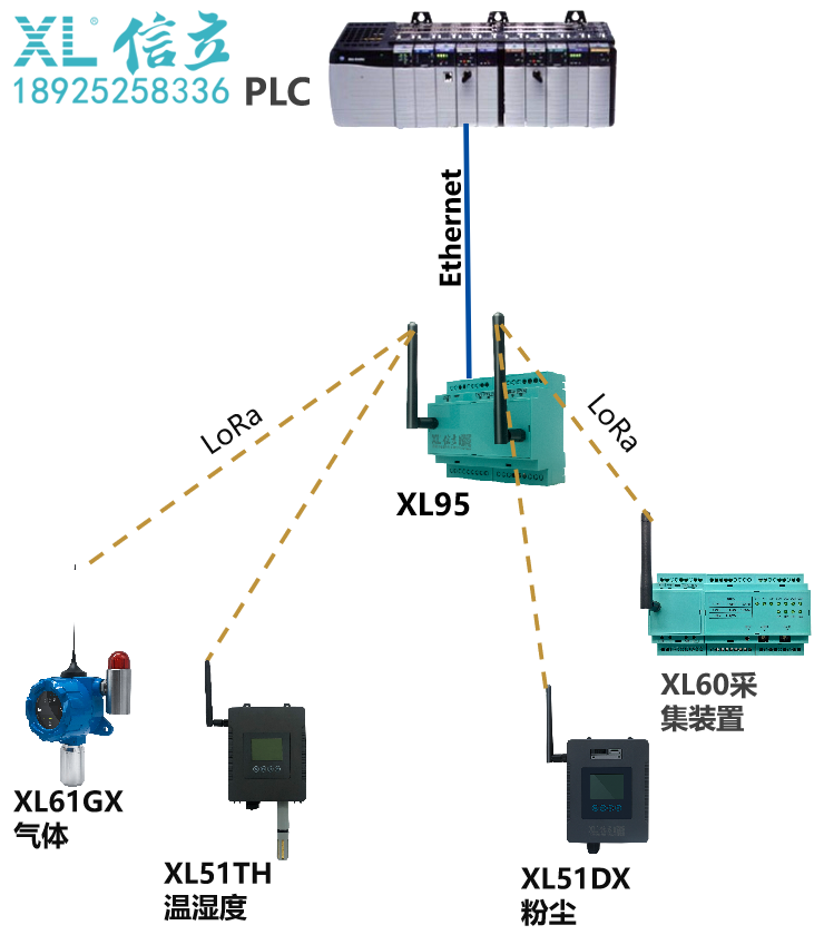 XL9X網關,無線讀取采集節點的數據,通過RS485,Ethernet轉發數據至PLC;
