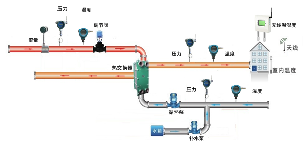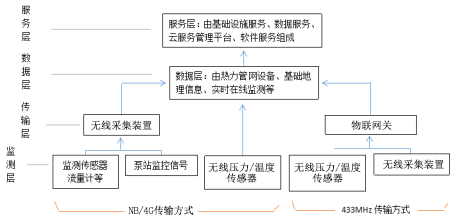 1、傳感器監測層:主要有各種監測傳感器組成,比如壓力、溫度、流量、地理與換熱站監控設備組成。