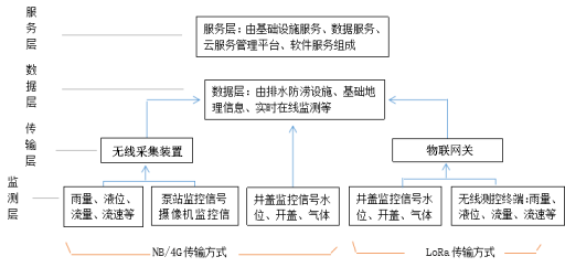 1、傳感器監測層:主要有各種監測傳感器組成,比如雨量、水位、流量、氣體、水質、地理、水文傳感器與泵站監控設備組成。