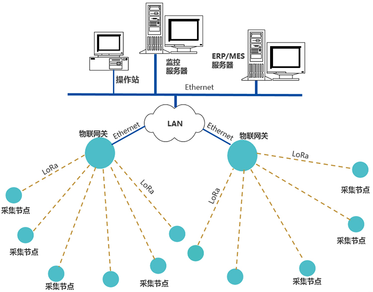 每個(gè)采集裝置、傳感器,通過(guò)LoRa無(wú)線(xiàn)通訊上傳數(shù)據(jù)至物聯(lián)網(wǎng)關(guān),網(wǎng)關(guān)通過(guò)Ethernet或Wi-Fi,接入LAN,推送數(shù)據(jù)至企業(yè)生產(chǎn)管控服務(wù)器。