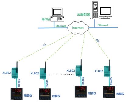 在每一個(gè)管網(wǎng)監(jiān)測(cè)點(diǎn),安裝1臺(tái)XL802無線通信主機(jī),通信主機(jī)通過RS485口讀取積算儀的數(shù)據(jù),經(jīng)過協(xié)議轉(zhuǎn)換,通過全網(wǎng)通4G,上傳數(shù)據(jù)至云服務(wù)器。