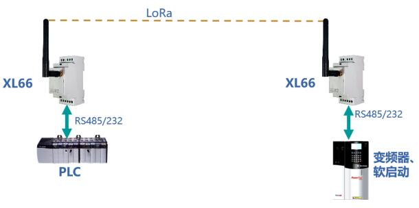 對于任意2臺帶RS485、232通信接口的設備,可分別與一臺XL66通過其RS485、232通信接口連接,其數據通過這2兩臺XL66,以無線通信方式實現數據透傳,從而免去現場繁雜的施工布線。