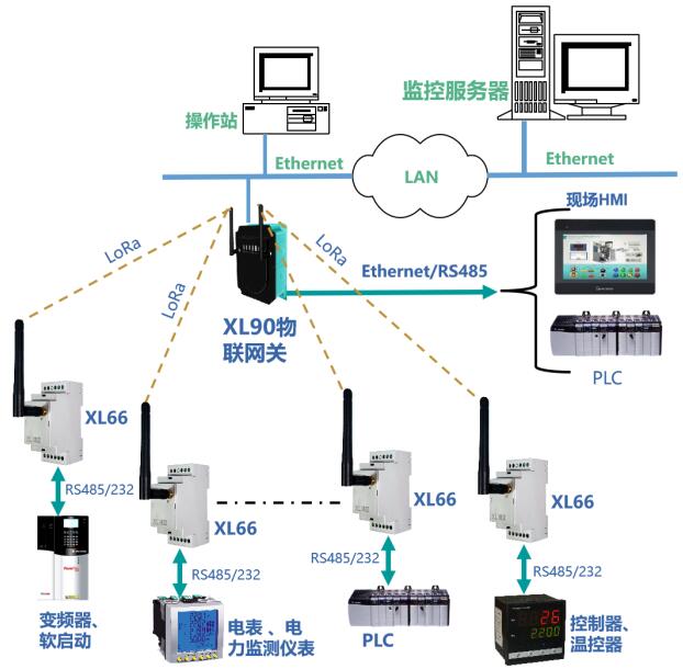 帶RS485或232通信接口的控制器、二次儀表、變送器等設備,通過通信接口與XL66連接,XL66通過LoRa無線通信方式將數據上傳至XL90或XL95物聯網關,網關通過以太網或RS485,上傳數據至監控平臺、PLC、觸摸屏、控制器等設備。從而實現有線串口設備的無線聯網。