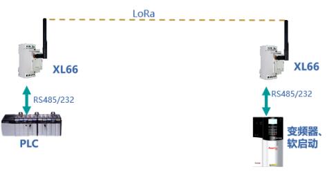 將一對XL66分別與兩臺有RS485/232通信口的設備連接,實現這兩臺串口設備的無線連接、通信。
