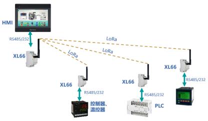 一臺XL66與多臺XL66連接,實現一對多,RS485/232設備間無線通信。