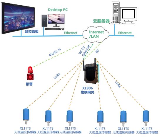 XL11TS無(wú)線溫度傳感器等采集節(jié)點(diǎn),通過(guò)LoRa無(wú)線傳輸技術(shù)將溫度數(shù)據(jù)傳輸至XL906網(wǎng)關(guān);