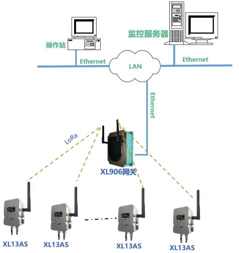 方案一:根據(jù)現(xiàn)場實際情況,部署XL906物聯(lián)網(wǎng)關(guān),XL13AS無線風管風速傳感器通過LoRa無線傳輸數(shù)據(jù)至XL906物聯(lián)網(wǎng)關(guān),網(wǎng)關(guān)可選Ethernet、Wi-Fi、4G等多種方式將風速數(shù)據(jù)傳輸至監(jiān)控平臺。