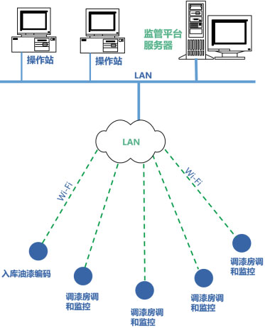 涂裝油漆調和監管系統,由監管平臺服務器、油漆調和操作監控終端、電子秤、油漆編碼終端、操作站等構成,通過工廠內的局域網(WI-FI)進行通信連接。