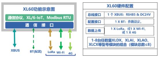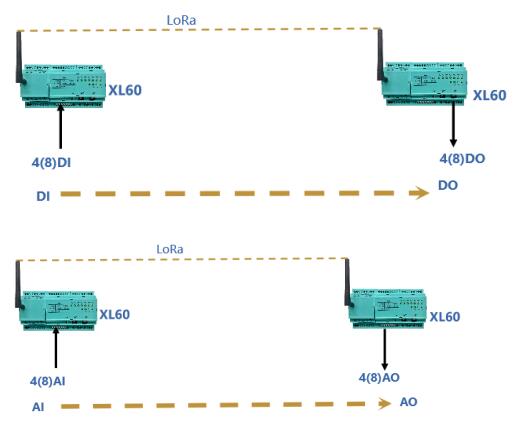 選擇一對(duì)基于LORA無(wú)線傳輸模塊的XL60主機(jī),其中一臺(tái)配置在現(xiàn)場(chǎng)采集端,通過(guò)RS485采集現(xiàn)場(chǎng)儀表的電流、電壓、開關(guān)等信號(hào),另一臺(tái)配置在控制儀表端,通過(guò)RS485與PLC、控制機(jī)臺(tái)、顯示儀表等連接,現(xiàn)場(chǎng)采集端的XL60可將采集到的數(shù)據(jù)通過(guò)LORA無(wú)線對(duì)傳到控制儀表端的XL60并上傳至控制儀表。