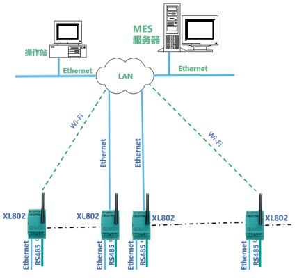設(shè)備接入:對于安裝分散,離LAN接口遠的設(shè)備,設(shè)計XL80安裝在LAN口附近接入局域網(wǎng),選擇XL66無線轉(zhuǎn)換器,連接設(shè)備RS485/RS232接口,實現(xiàn)設(shè)備無線連接XL80通信主機。