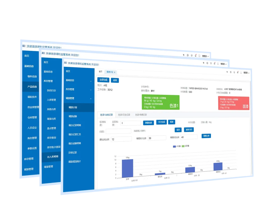 l 平臺(tái)自動(dòng)記錄、生成用戶所需的各類報(bào)表,如調(diào)漆成品統(tǒng)計(jì)、庫存余料盤點(diǎn)等報(bào)表;