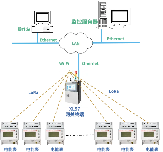DTSD3366D/XL系列三相電子式電能表,通過LoRa無線傳輸電流數據至XL97網關終端,可實現就地監控;XL97網關終端通過Ethernet或Wi-Fi推送數據至監控平臺,實現遠程監控。