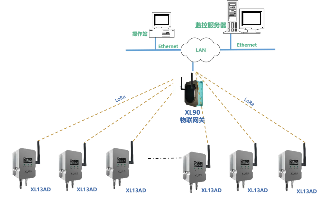 XL13AD無線壓差傳感器通過LoRa無線傳輸數據至XL906物聯網關,網關可選Ethernet、Wi-Fi、4G等多種方式將壓差數據傳輸至監控平臺,實現遠程監測。